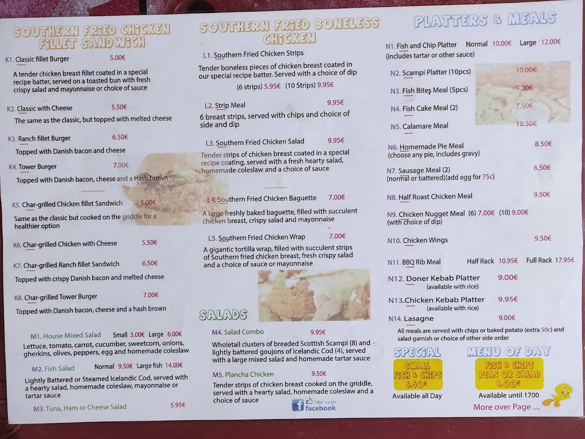 The menu at Tweetys Fish And Chips focuses primarily on classic fast food options, featuring a range of traditional fish and chips dishes alongside other fried and grilled items. Visitors can expect a variety of fish options such as cod, haddock, and place, typically served with chips and sides like mushy peas or salads.
