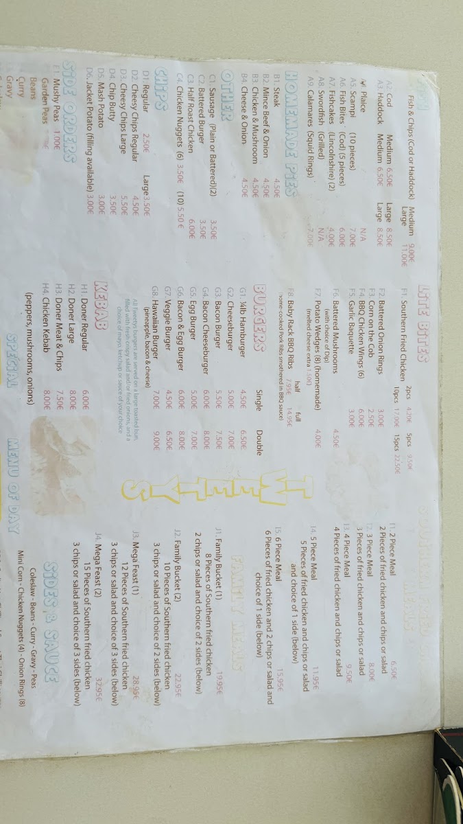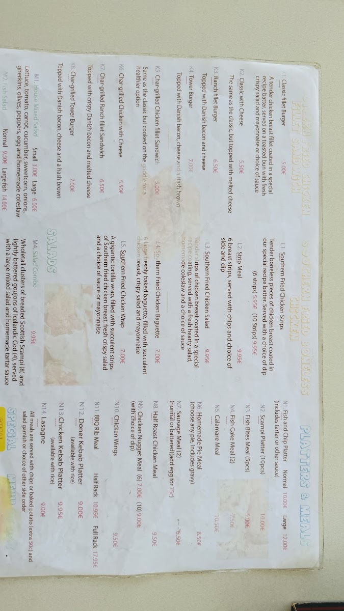 In addition to fish-based meals, the menu includes southern fried chicken, chicken wings, and scampi, catering to those looking for alternatives to fish. There are also kebab plates and pita kebabs available, offering a different style of fast casual dining. For convenience, burgers and cheeseburgers with fries are also part of the selection.